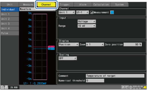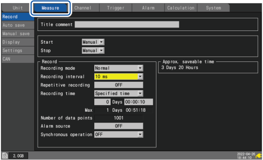 Before starting measurement, you must set measurement conditions such as recording interval and range.