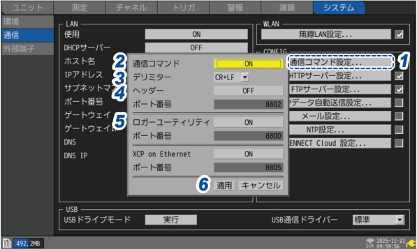 通信コマンドで制御する場合は、本器の設定が必要です。
